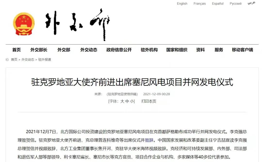 2021年12月7日,中國兵器工業(yè)集團(tuán)有限公司北方公司所屬北方國際投資、建設(shè)和運(yùn)營的塞尼156MW風(fēng)電項(xiàng)目在克羅地亞首都薩格勒布隆重舉行并網(wǎng)發(fā)電儀式。李克強(qiáng)總理致賀信??肆_地亞總理安德烈·普連科維奇,中國駐克羅地亞大使齊前進(jìn)出席儀式并致辭。中國國家發(fā)展和改革委員會(huì)副主任寧吉喆宣讀李克強(qiáng)總理賀信并視頻致辭,中國兵器工業(yè)集團(tuán)有限公司董事長焦開河、克駐華大使米海林視頻致辭。 中華人民共和國外交部報(bào)道 普連科維奇總理在致辭中表示,感謝李克強(qiáng)總理發(fā)來賀信,他與中國領(lǐng)導(dǎo)人一直非常重視塞尼風(fēng)電項(xiàng)目投資與建設(shè)。祝賀項(xiàng)目克服疫情與地震等影響,成功并網(wǎng)發(fā)電。增加清潔可再生能源、綠色電力對克乃至歐洲都很重要,克政府的重要戰(zhàn)略和目標(biāo)之一就是低碳發(fā)展和增加清潔能源供應(yīng)。塞尼風(fēng)電項(xiàng)目占克總發(fā)電量將達(dá)3.5%,對克實(shí)現(xiàn)2022年可再生能源比例30%目標(biāo)具有很大幫助。此次投資使北方國際成為在克最大的清潔能源投資企業(yè)。非常歡迎更多中國企業(yè)擴(kuò)大對克投資。 寧吉喆宣讀李克強(qiáng)總理賀信并視頻致辭時(shí)表示,2017年11月第六次中國—中東歐國家領(lǐng)導(dǎo)人會(huì)晤期間,在李克強(qiáng)總理和普連科維奇總理等中東歐16國領(lǐng)導(dǎo)人的共同見證下,塞尼項(xiàng)目簽署了協(xié)議。項(xiàng)目既是中國堅(jiān)定踐行綠色發(fā)展理念的具體體現(xiàn),也是中國深化與克羅地亞、與中東歐國家務(wù)實(shí)合作的生動(dòng)實(shí)踐。希望中克兩國政府部門,企業(yè)等有關(guān)各方共同努力、相互配合,運(yùn)營好塞尼項(xiàng)目,打造出中歐綠色合作的樣板,帶動(dòng)兩國務(wù)實(shí)合作持續(xù)深入發(fā)展,造福兩國人民。 焦開河在致辭時(shí)表示,在塞尼項(xiàng)目投入運(yùn)營之際,李克強(qiáng)總理專門致信祝賀。作為塞尼項(xiàng)目的投資方、建設(shè)方、運(yùn)營方,我們備受鼓舞,深感自豪!未來,中國兵器工業(yè)集團(tuán)有限公司將繼續(xù)深入貫徹落實(shí)習(xí)近平總書記重要指示批示精神和李克強(qiáng)總理賀信重要要求,以高標(biāo)準(zhǔn)、可持續(xù)、惠民生為目標(biāo),與克方合作伙伴坦誠溝通、攜手并進(jìn),進(jìn)一步推動(dòng)綠色能源建設(shè),努力打造更多的“一帶一路”標(biāo)志性、引領(lǐng)性、示范性項(xiàng)目,為鞏固中克戰(zhàn)略合作伙伴關(guān)系、推進(jìn)中克從經(jīng)貿(mào)領(lǐng)域到全方位合作貢獻(xiàn)積極力量。 齊前進(jìn)祝賀塞尼風(fēng)電項(xiàng)目順利完工和成功并網(wǎng)發(fā)電。他表示,塞尼風(fēng)電站項(xiàng)目并網(wǎng)發(fā)電是中克兩國領(lǐng)導(dǎo)人親自關(guān)注和推動(dòng)的成果。作為迄今最大的中國在克投資合作項(xiàng)目,塞尼風(fēng)電項(xiàng)目是中克和中歐綠色合作的典范,對克提高清潔能源生產(chǎn)消費(fèi)發(fā)揮著重要作用。項(xiàng)目建設(shè)過程中為當(dāng)?shù)嘏囵B(yǎng)了許多工程、技術(shù)和管理人才,帶動(dòng)了當(dāng)?shù)仄髽I(yè)發(fā)展,增加了就業(yè)和稅收,促進(jìn)了當(dāng)?shù)亟?jīng)濟(jì)社會(huì)發(fā)展,充分體現(xiàn)了中國對外經(jīng)貿(mào)合作與“一帶一路”倡議秉持的互利共贏、共同發(fā)展的理念,也是中國積極倡導(dǎo)的綠色低碳發(fā)展合作的典范。 塞尼項(xiàng)目位于克羅地亞中部亞得利亞海沿岸,建設(shè)總投資1.79億歐元,總裝機(jī)容量156MW,采用39臺4MW風(fēng)力發(fā)電機(jī)組設(shè)備,風(fēng)場面積達(dá)42.8平方公里。項(xiàng)目正式運(yùn)營后,預(yù)計(jì)每年平均發(fā)電超3000小時(shí),貢獻(xiàn)約5.3億度綠色電力,可減少二氧化碳排放約46萬噸,將為克羅地亞促進(jìn)能源轉(zhuǎn)型、發(fā)展綠色經(jīng)濟(jì)提供強(qiáng)勁助力,貢獻(xiàn)了“中國智慧”“中國方案”。 來源/中華人民共和國外交部、綜合有關(guān)報(bào)道 |