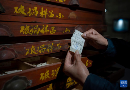 5月16日,工作人員在展示玻璃樣品柜內(nèi)的一個玻璃樣品。